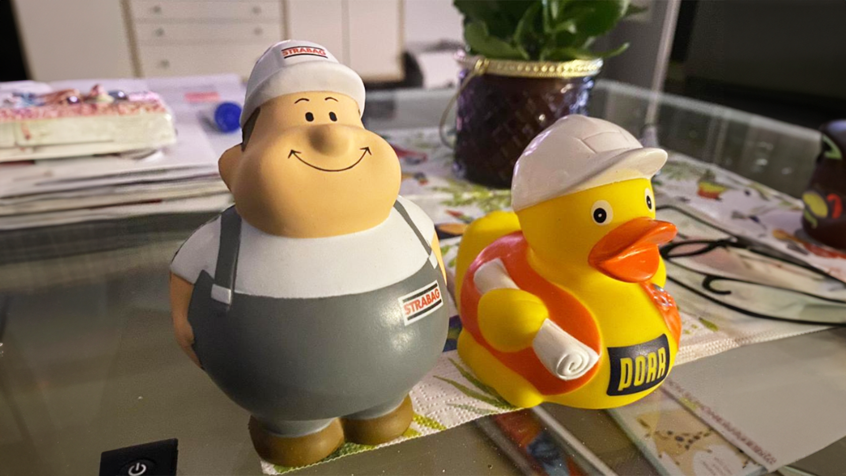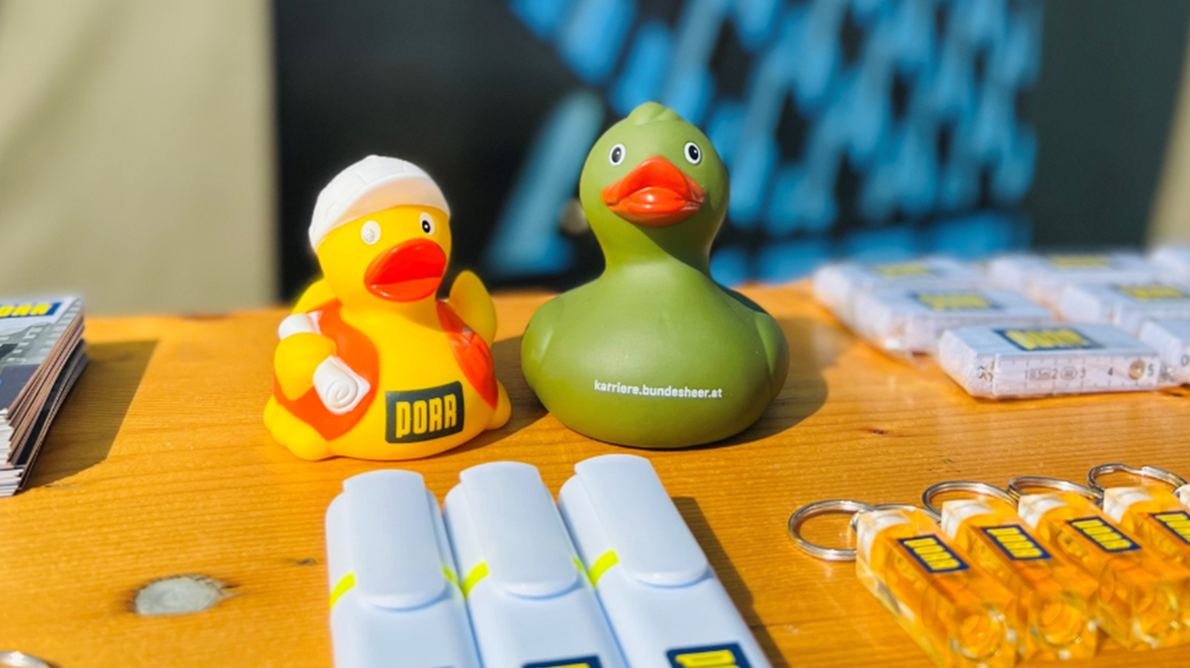 Zuerst nur als außergewöhnliches Werbemittel angedacht, sind unsere PORR Badeenten seit langem ein wichtiger Bestandteil unseres Außenauftritts. Egal ob bei Messen, Schulbesuchen oder Vorträgen - unsere PORR-Badeente ist meistens mit von der Partie und bei unseren Zielgruppen sehr beliebt. In ihrem charmanten Baustellen-Outfit passen sie sehr gut zu uns, wie wir finden und daher denken wir uns eigentlich eher "Warum nicht?".